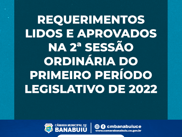 Acesse nossas redes sociais e confira os requerimentos lidos e aprovados na 2ª Sessão Ordinária do Primeiro Período Legislativo, que foi realizada no dia 11 de fevereiro 2022