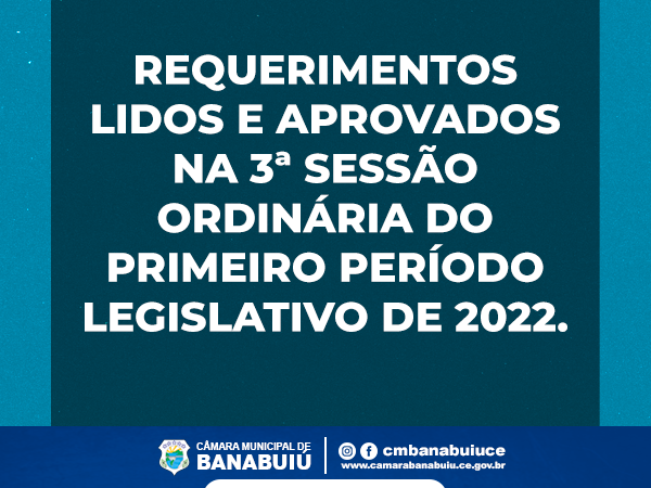 Acesse nossas redes sociais e confira os requerimentos lidos e aprovados na 3ª Sessão Ordinária do Primeiro Período Legislativo, que foi realizada no dia 18 de fevereiro 2022.
