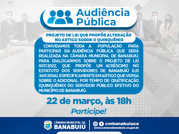 Convidamos toda a população para participar da audiência pública que será realizada na Câmara Municipal de Banabuiú, dia 22 de março, às 18h, para dialogarmos sobre o projeto de lei 007/2022, que propõe um acréscimo no Estatuto dos Servidores de Banabuiú (lei 369/2006), especificamente em artigo que versa sobre o adicional por tempo de gratificação (quinquênio) do servidor público efetivo do município de Banabuiú.