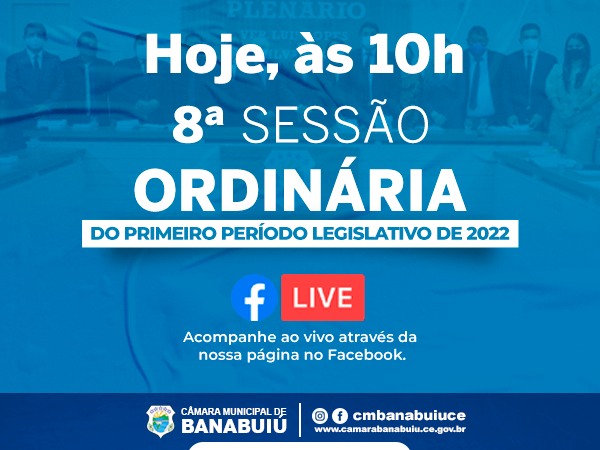 Hoje (24), quinta-feira, às 10 horas, teremos a nossa 8ª Sessão Ordinária do Primeiro Período Legislativo de 2022. Posted on 24 de março, 2022 | by Gabriel Martins | Leave a Comment on Hoje (24), quinta-feira, às 10 horas, teremos a nossa 8ª Sessão Ordinária do Primeiro Período Legislativo de 2022. Hoje (24), quinta-feira, às 10 horas, teremos a nossa 8ª Sessão Ordinária do Primeiro Período Legislativo de 2022.