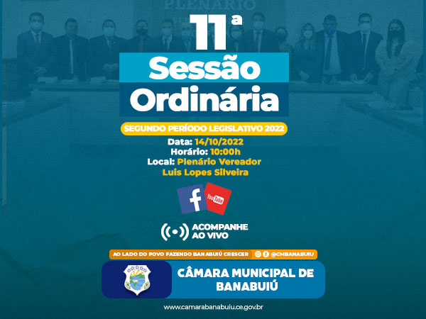 11ª SESSÃO ORDINÁRIA DO SEGUNDO PERÍODO LEGISLATIVO DE 2022. Posted on 14 de outubro, 2022 | by Gabriel Martins | Leave a Comment on 11ª SESSÃO ORDINÁRIA DO SEGUNDO PERÍODO LEGISLATIVO DE 2022. Você poderá acompanhar a Sessão de modo presencial ou virtual nas plataformas da instituição.
