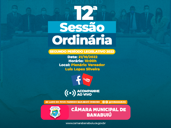 12ª SESSÃO ORDINÁRIA DO SEGUNDO PERÍODO LEGISLATIVO DE 2022. Posted on 21 de outubro, 2022 | by Gabriel Martins | Leave a Comment on 12ª SESSÃO ORDINÁRIA DO SEGUNDO PERÍODO LEGISLATIVO DE 2022. 12ª SESSÃO ORDINÁRIA DO SEGUNDO PERÍODO LEGISLATIVO DE 2022.