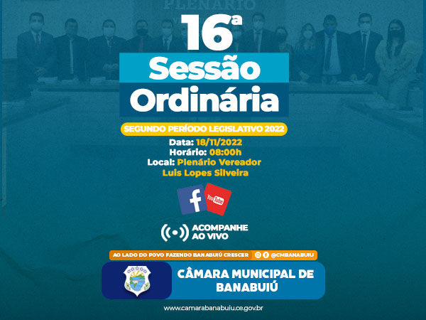 16ª SESSÃO ORDINÁRIA DO SEGUNDO PERÍODO LEGISLATIVO DE 2022. Posted on 17 de novembro, 2022 | by Gabriel Martins | Leave a Comment on 16ª SESSÃO ORDINÁRIA DO SEGUNDO PERÍODO LEGISLATIVO DE 2022. Amanhã teremos a nossa 16ª Sessão Ordinária do Segundo Período Legislativo de 2022.