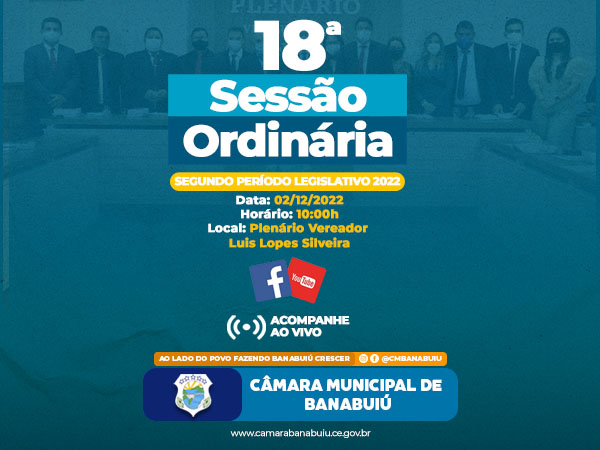 HOJE TEREMOS A NOSSA 18ª SESSÃO ORDINÁRIA DO SEGUNDO PERÍODO LEGISLATIVO DE 2022. Posted on 2 de dezembro, 2022 | by Gabriel Martins | Leave a Comment on HOJE TEREMOS A NOSSA 18ª SESSÃO ORDINÁRIA DO SEGUNDO PERÍODO LEGISLATIVO DE 2022. Você poderá acompanhar a Sessão de modo presencial ou virtual nas plataformas da instituição.