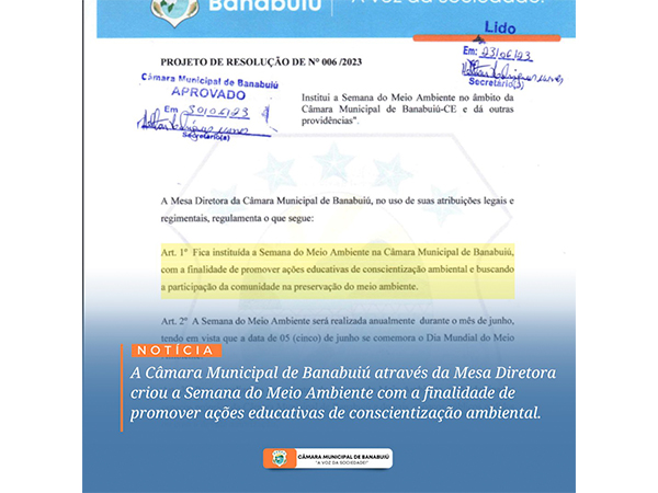 CÂMARA MUNICIPAL DE BANABUIÚ ATRAVÉS DA MESA DIRETORA CRIA A SEMANA DO MEIO AMBIENTE NO ÂMBITO DA CASA LEGISLATIVA.