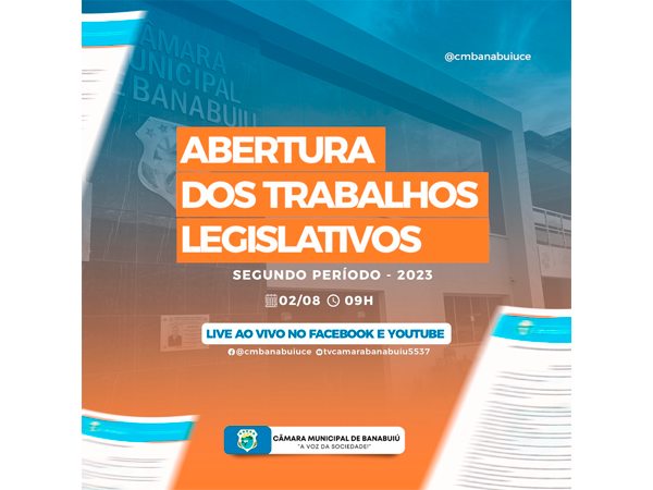 Nesta quarta-feira, 02 de agosto, teremos a abertura dos trabalhos legislativos no segundo período de 2023 na Câmara Municipal de Banabuiú!
