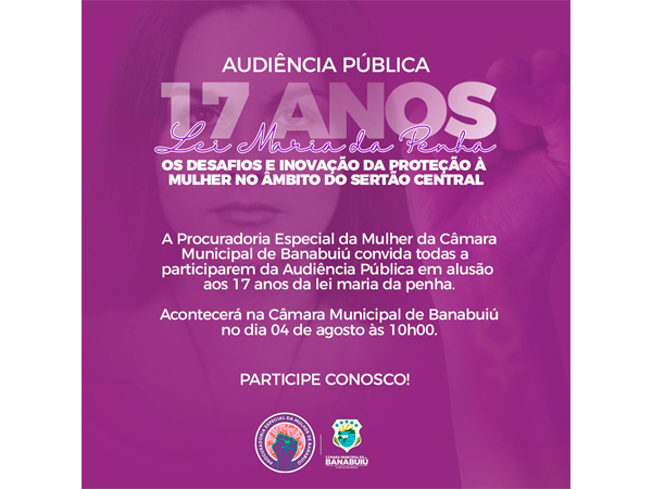 A Procuradoria Especial da Mulher da Câmara Municipal de Banabuiú convida todas a participarem da Audiência Pública em alusão aos 17 anos da Lei Maria da Penha.
