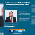 | MATÉRIAS APROVADAS NA 15ª SESSÃO ORDINÁRIA DO SEGUNDO PERÍODO LEGISLATIVO DE 2022. | ![]() | Ver |