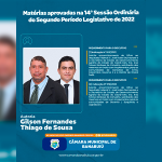 | MATÉRIAS APROVADAS NA 14ª SESSÃO ORDINÁRIA DO SEGUNDO PERÍODO LEGISLATIVO DE 2022. | ![]() | Ver |